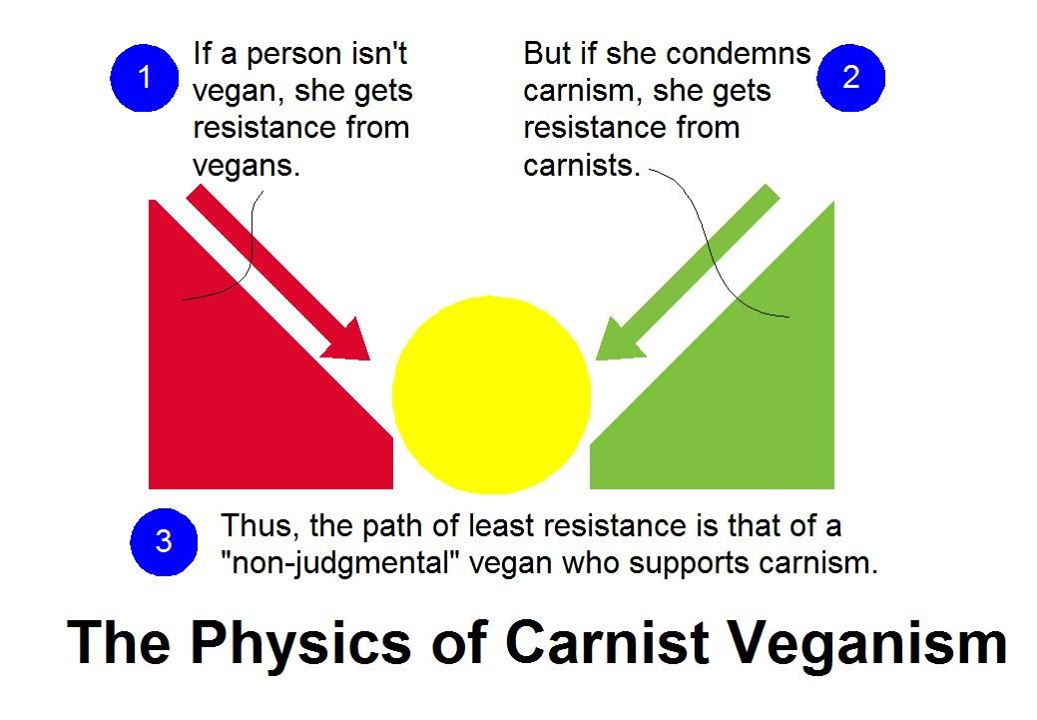 The chart above summarizes how carnist veganism works. Since vegans will resist a non-vegan, and since carnists will resist anyone who exposes the psychopathology of carnism, the way to maximize one’s own personal popularity is to follow a “vegan lifestyle” while remaining “non-judgmental”—and, indeed, supportive—of the carnist way of death. In other words, the point of equilibrium for people-pleasers and popularity-seekers is that of carnist veganism.