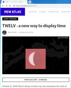 TWELV Reviews “TWELV – a new way to display time” by Mike Hanlon, New Atlas October 12th, 2006 Click to visit the original article